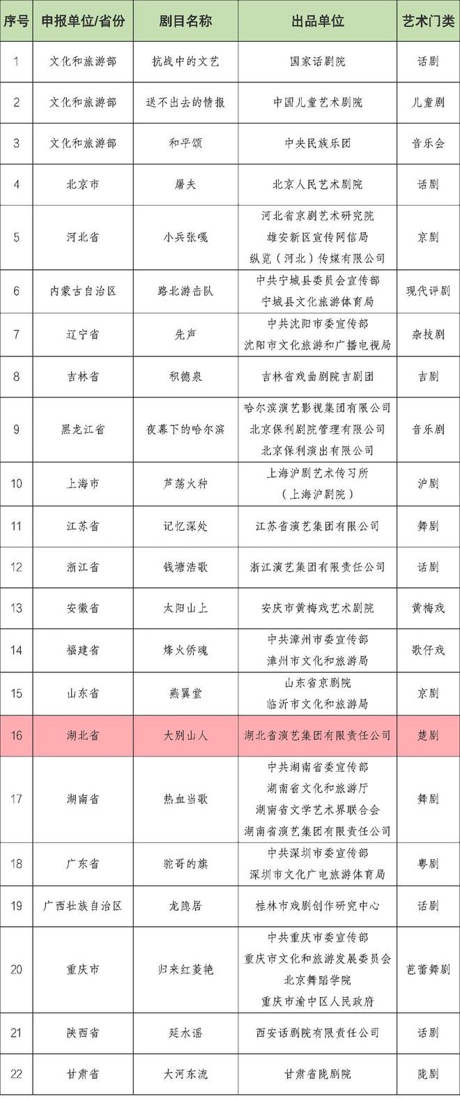 2025年是中国人民抗日战争暨世界反法西斯战争胜利80周年,中央宣传部、文化和旅游部围绕“铭记历史、缅怀先烈、珍爱和平、开创未来”主题,在全国范围内遴选22部反映纪念中国人民抗日战争暨世界反法西斯战争胜利题材的优秀舞台艺术作品,并于近日联合发布展演通知。由湖北省演艺集团出品的楚剧《大别山人》名列其中,将与其他21部作品在8月至10月期间进京演出。