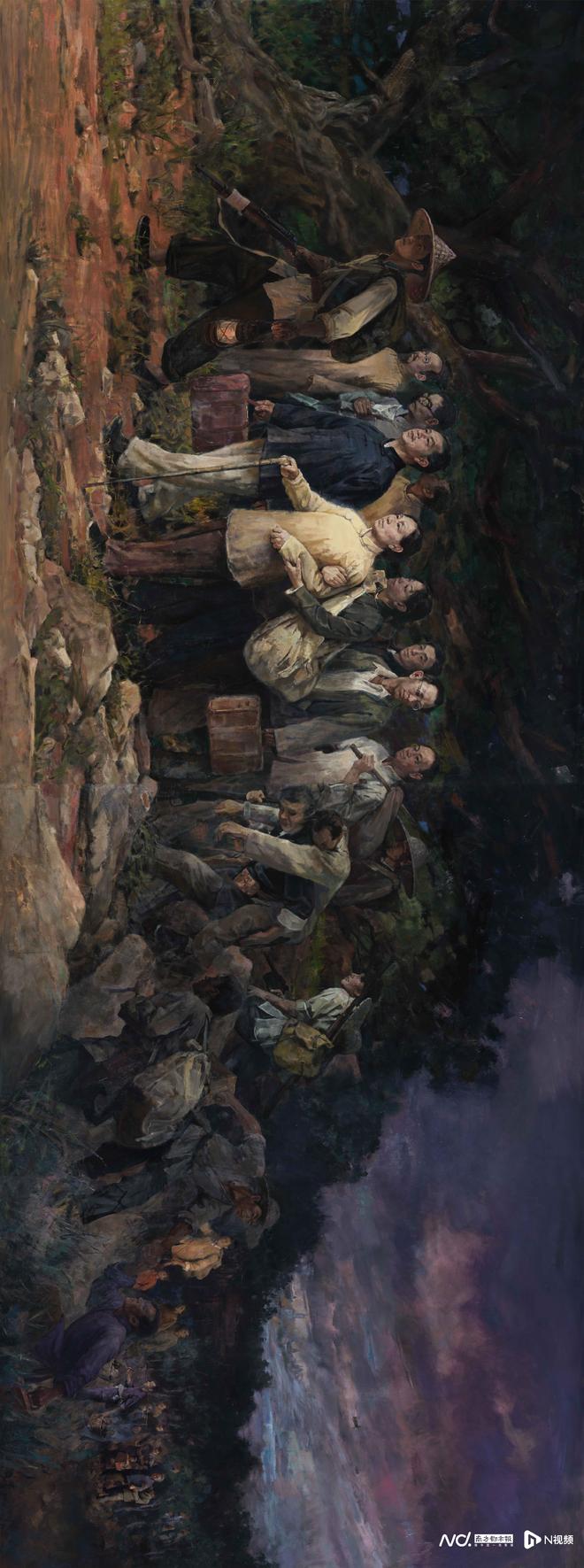 人物塑造是历史题材绘画的核心。在这张长8米、高3米的长卷式构图中,人物动线从右往左,从后方陆续跟进的人群,到被护送的文化人士,再到引路的游击队员,层次分明,如同叙事般推动视觉流动,把大营救的紧张过程与规模生动展现,具有强烈的故事性与节奏感。