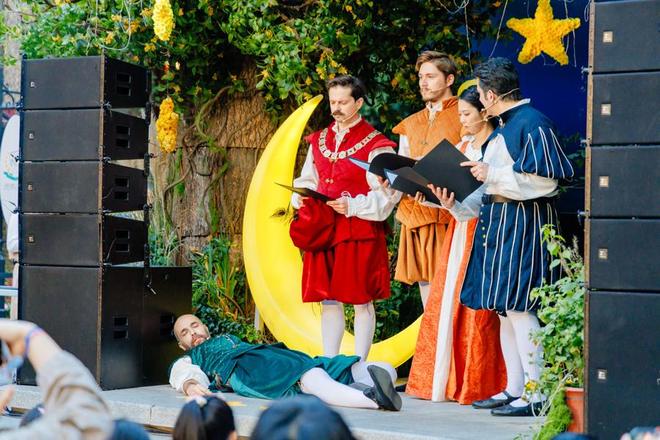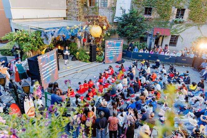 当罗密欧挥别朱丽叶,两位演员迅速转场至广场中央的正式舞台。这个被爬山虎环绕、藤条编织的书页下爬满鲜花的临时舞台,在蓝色纱幕的装点下幻化成浪漫夜空。法国歌剧团队为此次上海之行特地重新制作了服装,编剧莫里西担任串讲人,带领观众沉浸在这个跨越四百年的爱情故事中。