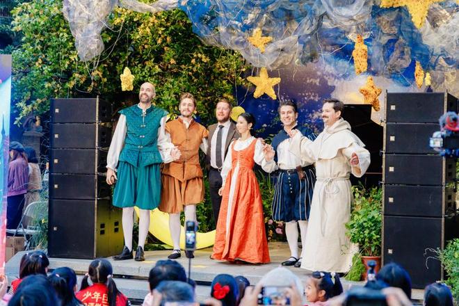 下午四时许,秋日暖阳透过泛黄的梧桐叶,在思南公馆的百年建筑群间洒下斑驳光影。突然,二楼阳台的门打开了——身着戏服的罗密欧与朱丽叶相继现身,开始了那场经典的阳台相会。没有舞台灯光,自然光勾勒出演员的身影。没有剧场音响,他们的歌声在老建筑间自然回荡。
