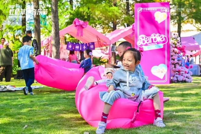 音乐会演出场地外,新虹桥中心花园草坪上,粉红主题的“蝴蝶结市集”聚集超过40家摊位,覆盖吃、喝、玩全品类项目,吸引着周边市民游客。“文创潮品区” 以粉色为主打色,推出音乐节限定周边,更有创意手作、独立设计等丰富内容供游客市民打卡消费;“美食体验区” 集结上海老字号与当下潮流美食,既有等本土风味,也有网红小吃、创意甜品,满足不同观众的味蕾需求;“生活美学区” 则引入手作体验、花艺香薰、时尚摆件等商户,让市民在聆听音乐的同时,体验 “慢生活” 的乐趣。现场大量粉色花朵、粉色蝴蝶结装饰相映成趣,草坪上散落着粉色充气沙发供市民休憩,市集区域的摊位更是清一色粉色装扮。有乐手在场边进行轻松的演唱,整个场地洋溢着轻松愉悦的氛围。