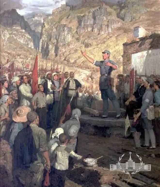 汤小铭的油画《抗日战歌响彻太行山》,描绘了太行军民集会誓师的激昂场景