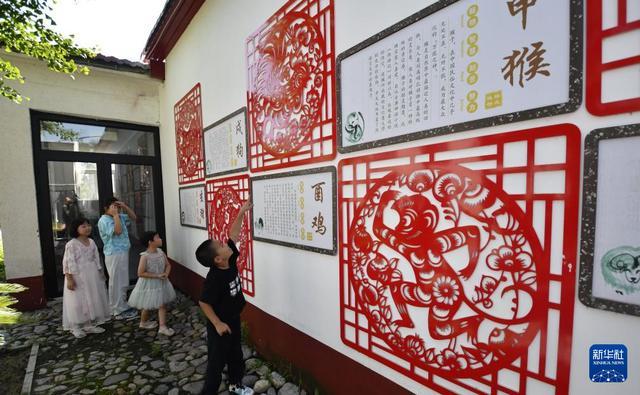 在怀柔区桥梓镇禧宝露文化中心,孩子们观看剪纸技艺十二生肖墙(8月6日摄)。