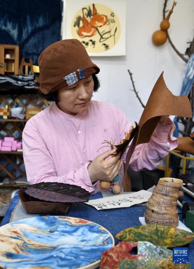 在怀柔区桥梓镇禧宝露文化中心,髹漆皮艺技师任捷在研究皮艺制作的原材料(8月6日摄)。