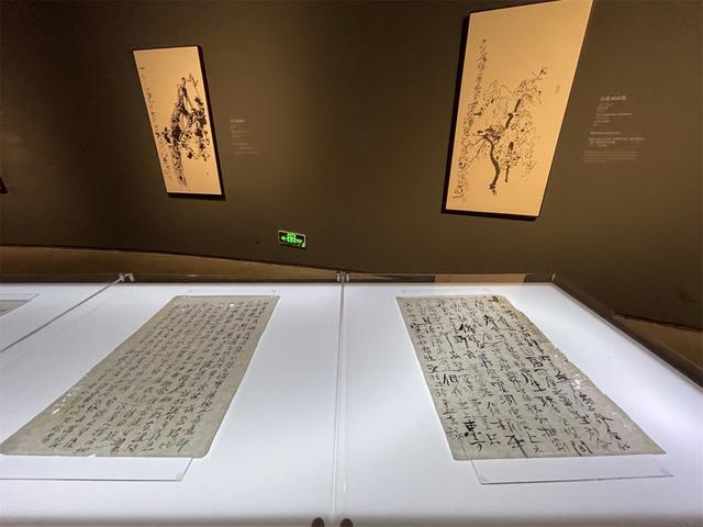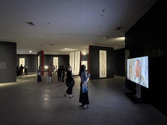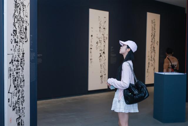 南京艺术学院美术馆表示,选择以“石虎书”而非“石虎书法”命名展览,正契合了艺术家不愿被传统名词定义的立场。然而在展览现场,一些展柜中的手稿其实正呈现了石虎对传统书法的深厚功力。而在墙上的巨幅书法中,无论是《信天游》,还是《海念》《卉毫》《烛纸》等作品,一些字几乎不可辨识,然而其气势与力量以及一种生命的挣扎却清晰可见,可以看到石虎的“两个回到”理念——回到“造笔之初”和回到“造字之初”,构成了他艺术道路的两大支柱。