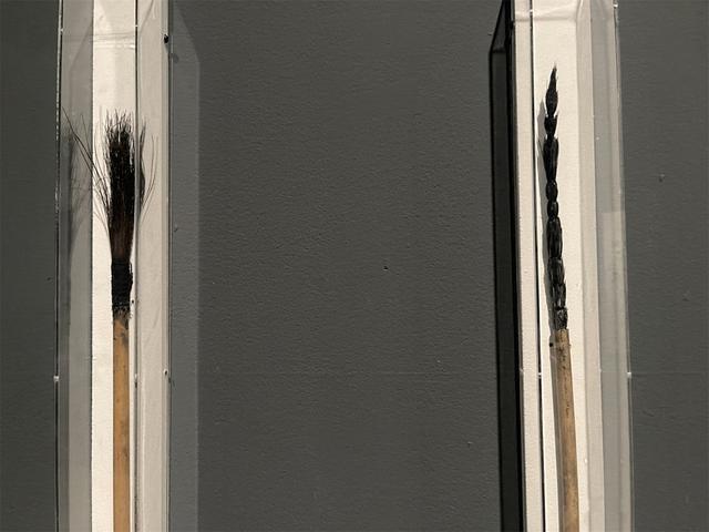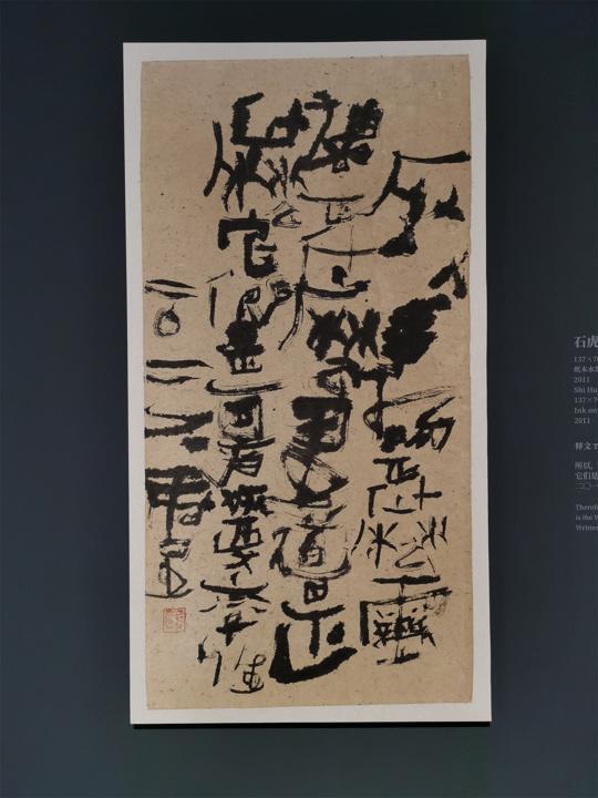 而在南京艺术学院美术馆的“石虎书:他的另一条艺术探索之路”展览上,则呈现了他对中国书法的追溯,展览现场,那些形制奇特的毛笔静静地躺在展柜中,与墙面上奔放的墨迹相互映照。石虎自制的若干孔雀毛笔首次亮相,这些毛笔是他艺术探索的物质起点,也是他“回到造笔之初”理念的生动体现。传统制笔讲究“尖齐圆健”的实用标准,而石虎却反其道而行——他突破“尖齐圆”的束缚,采用孔雀毛等制笔,形成不可控的效果。毛笔与展墙上那些率性恣肆、墨象淋漓的石虎书法形成了一种无声的对话。对这种工具革新的意义,学者认为体现了石虎的创作理念:唯有改变工具,才能解放笔法,进而展现当代人对线条与空间的独特理解。