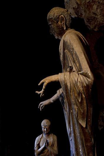 麦积山第133窟的“释迦会子”似乎是个特例,诉说了一段动人的故事。这组宋代雕塑由一大一小两尊立佛组成,大佛高约3.5米,身形高大伟岸,小佛位于大佛右前方,高1.6米,身形瘦小。依据佛经故事,该组造像被命名为“释迦会子”,也叫“罗睺罗授记”。罗睺罗是释迦牟尼出家前的孩子,他6岁时,释迦牟尼回到故乡迦毗罗卫城说法。罗睺罗的母亲对他说:“谁是你的父亲,就去到他身边吧。”小小年纪的罗睺罗从一千多名比丘中认出了父亲,侧身停在他足边。