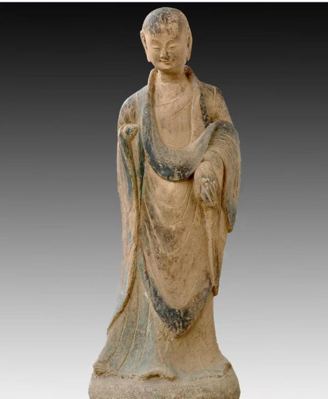 这尊小沙弥身高不足1米,细颈削肩,挺胸鼓腹,身着宽大的袈裟,充分体现了北魏“秀骨清像”的造像风格。他的身体略前倾而立,头稍稍低下,双唇轻闭而嘴角上扬,一双细长凤眼满含天真的笑意,似乎难掩心中的欢欣与喜悦。他的微笑中蕴含着对永恒世界的向往,对知识与真理的渴望,穿越千年,依然打动人心。