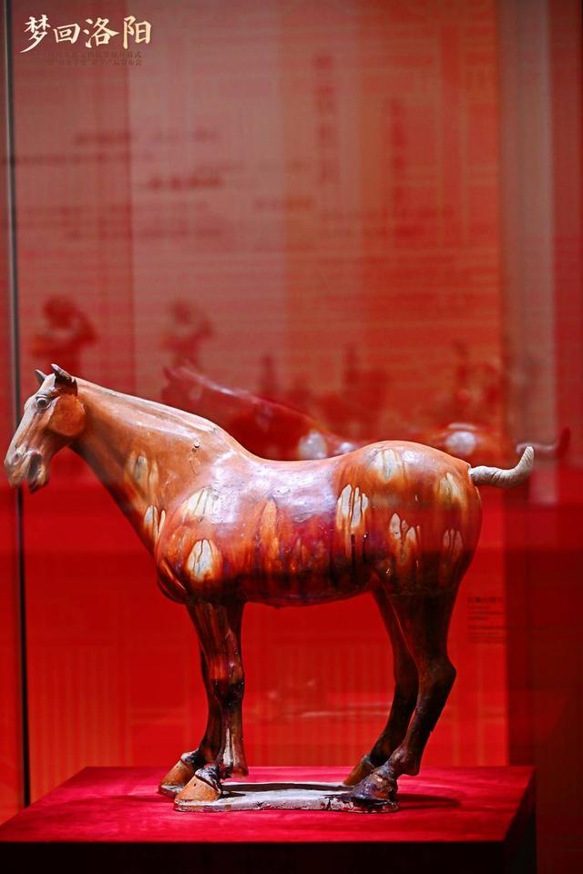 “这两件文物,都是来自洛阳博物馆的一级文物。透过这件三彩骆驼,可以看到当时陆上丝绸之路兴盛的景象。”现场,三彩骆驼昂首嘶鸣的身姿勾勒出驼队穿越漠野的壮阔画面。而另一件展出的红釉白斑马(1972年洛阳关林唐墓出土)身形健硕,肌理匀称,体现出了唐代制陶工艺的精湛。“此外,展览中还有很多骑马俑,反映了唐朝人喜欢骑马的文娱生活。”
