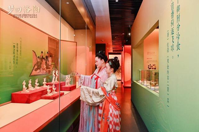 现场,展览以“梦回洛阳”为叙事核心,以杜甫的第一人称视角为线索,展出了来自洛阳博物馆、偃师博物馆等文博单位的百余件精品文物,串联展示洛阳作为政治之都、商贸之都、诗歌之都、音乐之都的多元文化面貌,回溯唐代洛阳的经济繁荣和文化交融的盛况。