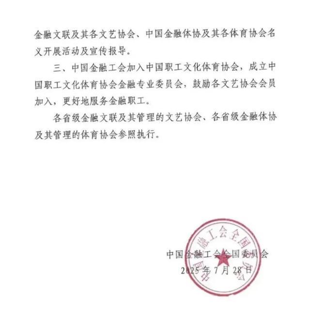 近日,中国金融工会发布《关于中国金融文学艺术界联合会、中国金融体育协会全国理事会有关情况的通知》: