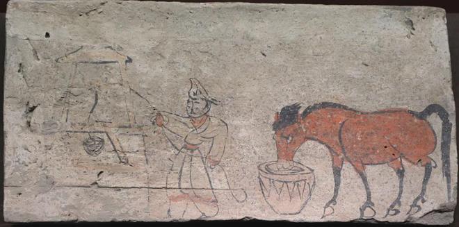 除肃州区博物馆馆藏汉代陶井外,该馆所藏魏晋时期汲水题材壁画砖,生动再现了当时社会生活中的汲水场景。该壁画砖出土于肃州区果园乡西沟村六组七号墓葬。肃州区果园乡西沟村六组属酒泉市知名古墓葬群分布区域,截至目前,该区域已发现多件具有较高价值的画像砖,具体包括展现滤醋场景、女子以盆中热水烫鸡场景、男子在厨房劳作场景的画像砖。