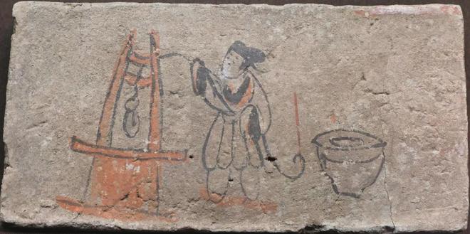 汲水壁画砖规格为通长33.5厘米、宽17厘米、厚4.9厘米,采用墨线勾勒技法,辅以赭石、石绿等矿物颜料着色。画面左侧为一口红色辘轳水井,右侧为一名身着宽袍大袖、发髻向后的侍女;侍女手持井绳,将盛水器物垂入井中,显然是在汲水。侍女右侧的大瓮腹部有一圈波纹,表明其内部大部分空间已盛满清水。