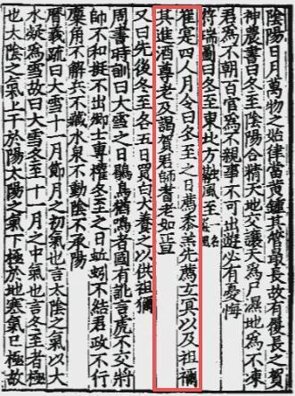 十一月,冬至之日,荐黍、羔;先荐玄冥于井,以及祖祢。齐、馔、扫、涤,如荐黍、豚。其进酒尊长,及修刺谒贺君、师、耆老,如正月(日)。