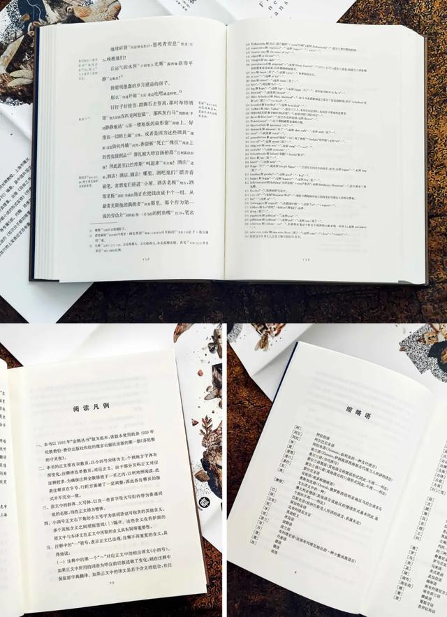 为了解决这个问题,戴从容选择采取中国古代的“注疏体”的形式,来翻译《芬尼根的守灵夜》。这种新式“注疏体”在书籍排版上的呈现方式,就是将小说的正文翻译内容用大字书写,印在左侧的页面上,将其中一些词语的可能含义用稍小的字号直接印在正文中这个词语的后面,用竖线隔开,而其他一些需要注释的内容,就统统放在右侧的页面上。最终,她一共为这本“天书”添加了高达41856条注释。