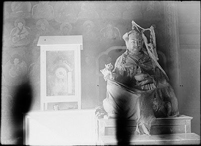 布达拉宫内部陈设,左为一件钟表,右为莲花生大师像,1936年,Frederick Spencer Chapman摄