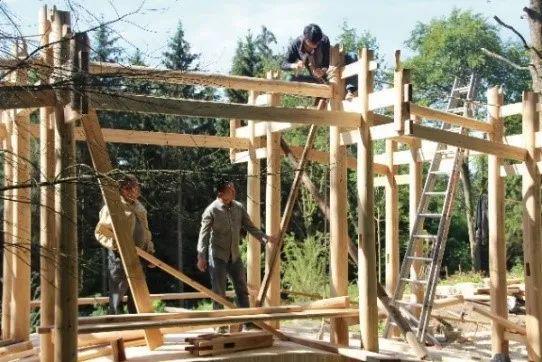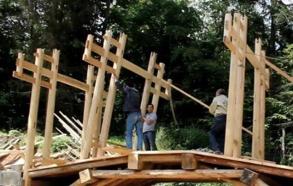 穿斗构架施工:扶立横架、连接横架。雷根斯堡中国桥,闽北匠人建造。(刘妍/摄)