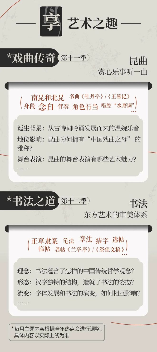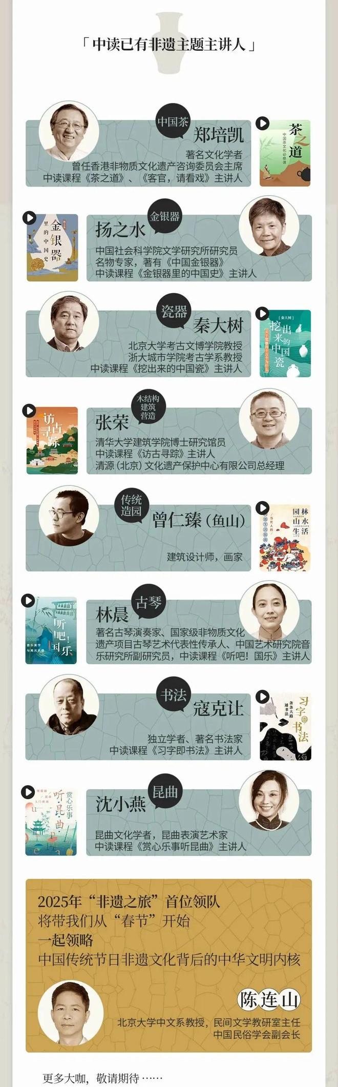 随着更新,非遗讲师团的构成将更加多元化。非遗文化学者+非遗技艺传承人,两组人马,两种视野,每月一个新主题,带我们踏上持续一整年的非遗文化之旅。