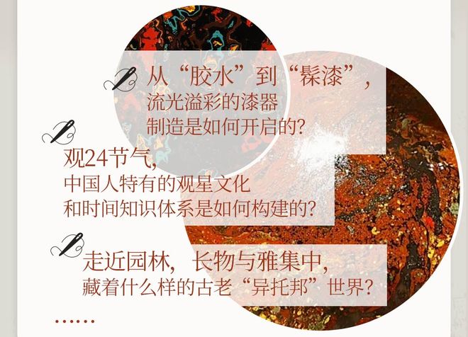 传统节日,二十四节气,古建筑,桑蚕丝织,漆器,中国茶,书法,园林,酒之道,瓷器,金属器,昆曲……传承演变、文化内涵,一目了然。