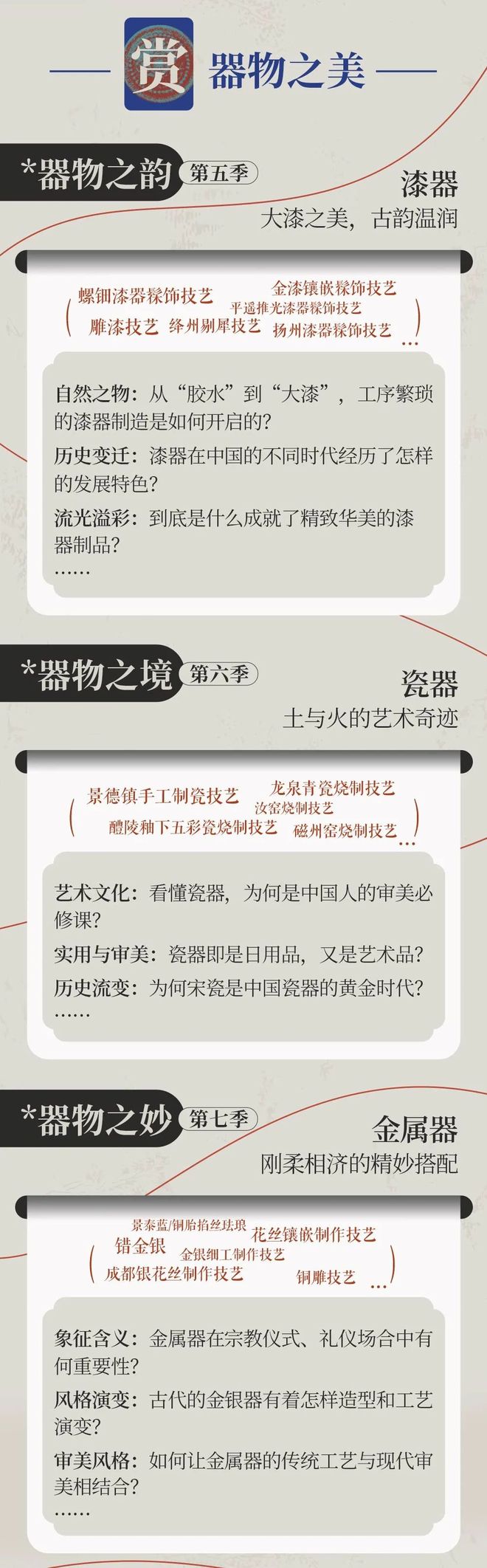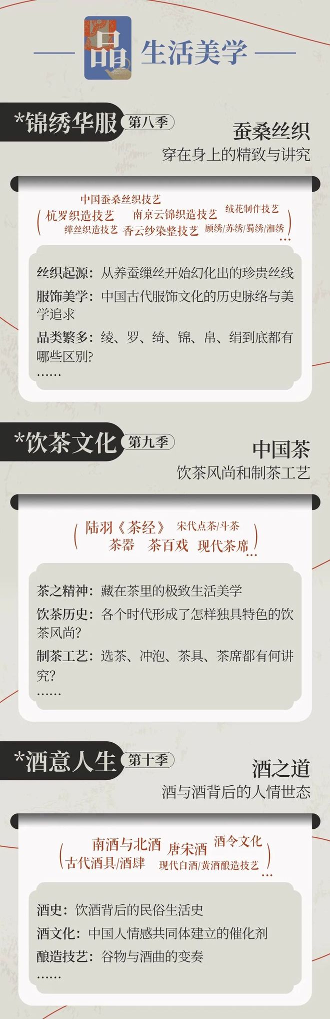 我们从紧贴生活的5大类别中,延伸12种非遗,每一季课程专讲一种,希望能够和你一寸一寸讲透它。