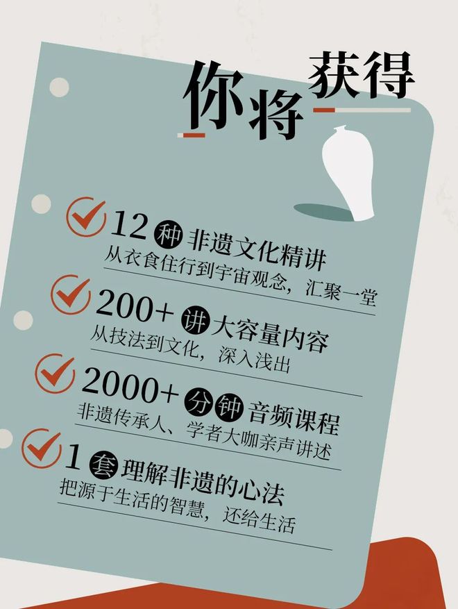 200+节文化熏陶,2000+分钟讲述,带你从历史到生活,从审美到认知,回归生活,悟得非遗本心。