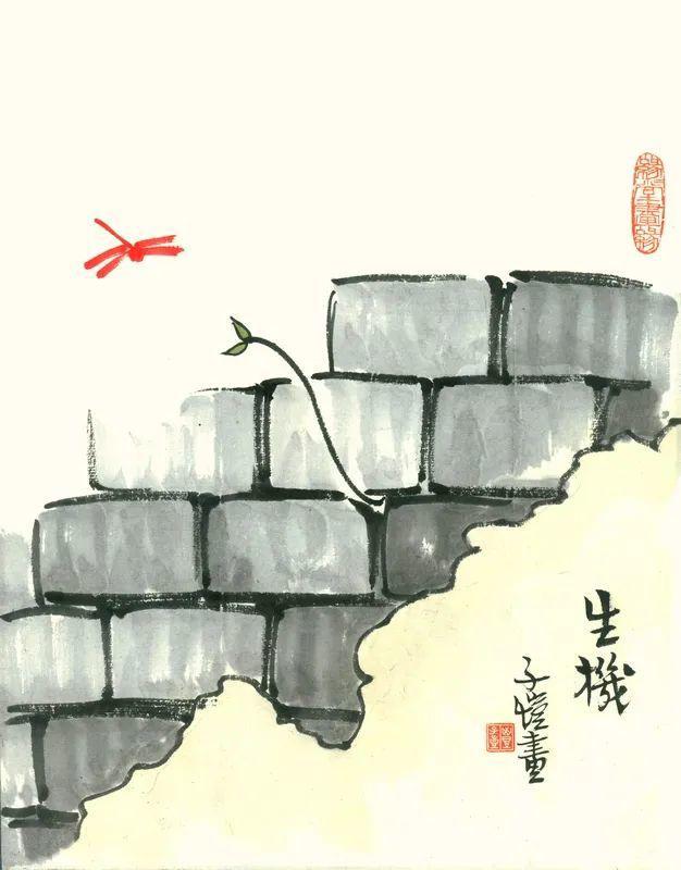 重生的大树不屈不挠,春天的小草倔强生长。一株在断壁残垣中的小草,激发了画家的创作灵感,他为此画了《生机》,纤细柔弱的小草,从灰暗的断壁中探出头来,沐浴在春天的阳光里,一只红色的蜻蜓翩然而至,似乎在和绿色的嫩芽窃窃私语。画面右下角的留白,好像云烟蒸腾,“生机”二字,既醒目,又点题。《战场之春》中,地面静静躺着一顶军帽,暗示着一个年轻生命的逝去。而战场的沙袋上,居然冒出一棵小草,在冰冷的铁丝网边昂首向天,喻示中国人民不灭的斗志,不息的生机。