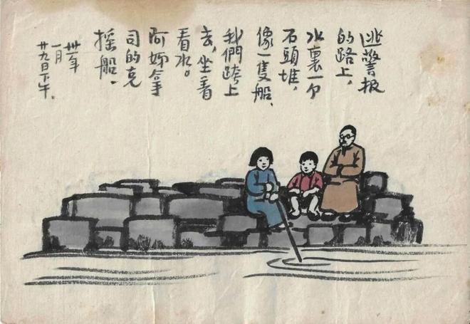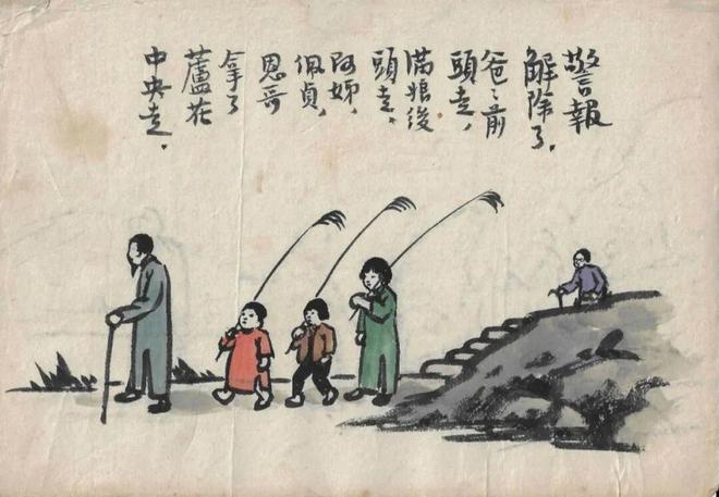 他还曾画过多幅躲避空袭的漫画,这些作品构思巧妙,不画人们的惊慌无措,而是画人们的镇定自若,甚至悠然自得。他的小儿子出生于逃难途中,逃警报成为孩子的日常,他画《恩狗逃警报》,三个人惬意地坐在一块大石头上,画上题到:“逃警报的路上,水里一个石头堆,像一只船,我们跨上去,坐着看水。阿姊拿司的克摇船。”在《警报解除了》中,他画老少五人漫步山中,画上题到:“警报解除了,爸爸前头走,满娘后头走,阿姊、佩贞、恩哥拿了芦花中央走。”逃警报成了逍遥游。他画防空洞里埋头看书的人,防空洞成了桃花源。他画《警报作媒人》,青年男女因在山洞里躲避空袭而成就一世良缘,警报成了月老。这些恬静安宁的画面,是对敌人的藐视,对和平的向往。他的次女林先在抗战期间举行婚礼,他作此画作为贺礼。女儿生了孩子后,他创作《大树垂枝,保我赤子》,以此祝福外孙在祖国的怀抱里茁壮成长。抗战胜利后,他画《胜利之夜》,画中那个被高举在空中的孩子,正是“大树”所保的赤子。
