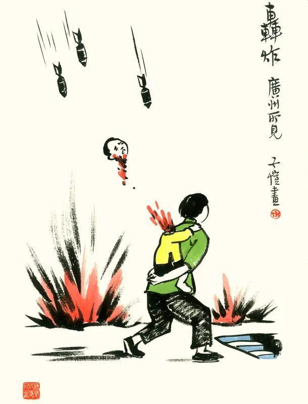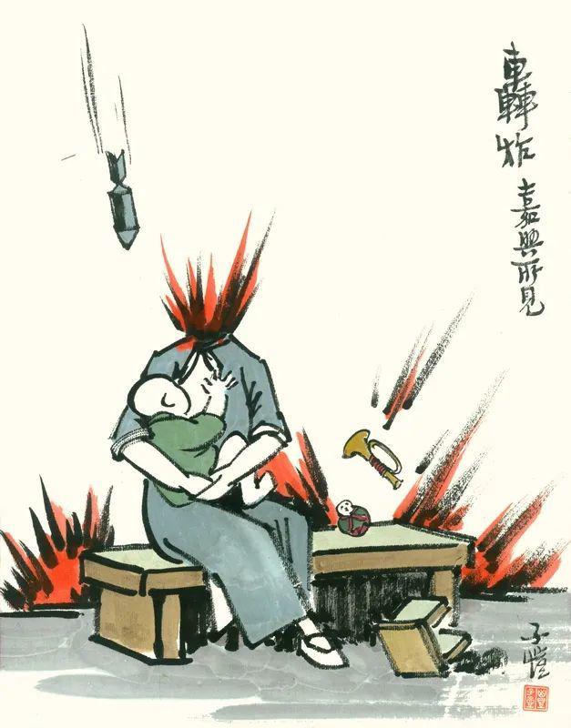 丰子恺以笔当刀,其抗战漫画一改往日隽永之风。他以悲愤之笔,直录惨烈之状,画下《轰炸》系列作品:正在哺乳的母亲头颅被炸飞,依然紧抱婴儿;躲避空袭的母亲仓皇奔逃,背上的孩子已无头;一只狗衔着一条滴血残肢,却不知正是自家小主人的……画中的题诗更是椎心泣血:“空袭也,炸弹向谁投?怀里娇儿犹索乳,眼前慈母已无头,血乳相和流。”画与诗皆令人触目惊心!
