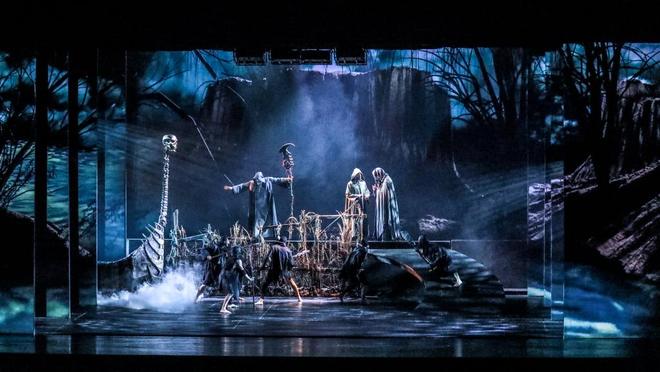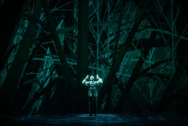 音乐剧《神曲》较大的看点之一就是舞台设计,不同于传统的布景,《神曲》的3D投影舞美设计让观众进入一座流动的剧场,为还原但丁《神曲》中的历史章节和故事,舞台以复杂的机械装置与3D动态投影结合。例如对第十三章:自杀者树林(暴力之罚)的呈现中,自杀者化为扭曲树木,被哈尔皮女妖啄食,诗人彼埃尔讲述因政治迫害自杀的遭遇,在舞台设计中,机械装置模拟着扭曲树形,诗人的双手已经化成干枯的枝干,痛苦地摆动,投影也强化了诗人的痛苦意象。