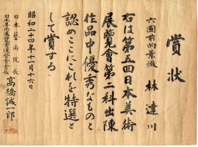 《窗前的景致》第五回文展获奖证书