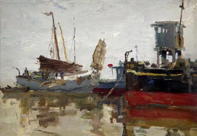 镇江小长江码头写生稿,1961年,纸板油画