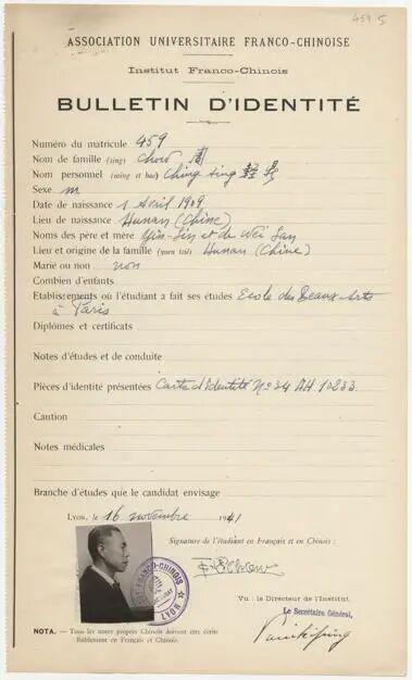 周轻鼎里昂时期中法大学身份卡,1941年起,里昂市立图书馆中文部,中法大学文献藏档[A459]-5(由里昂第三大学托管),©️里昂市立图书馆拍摄