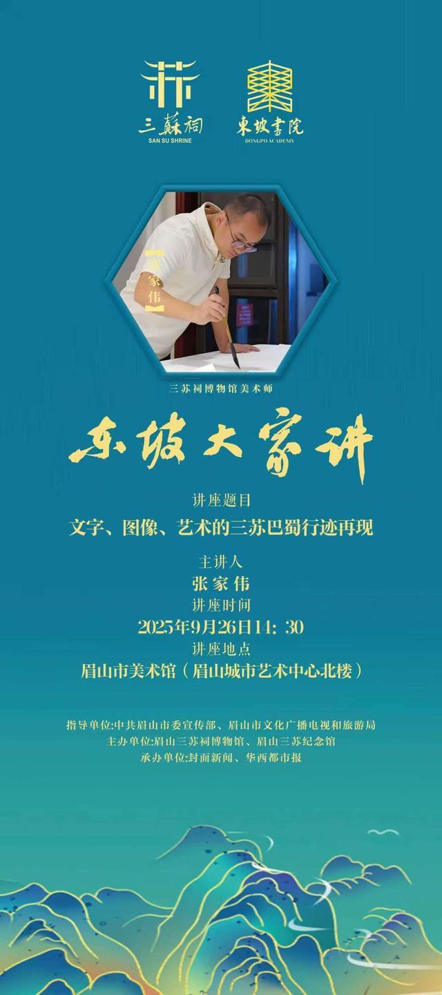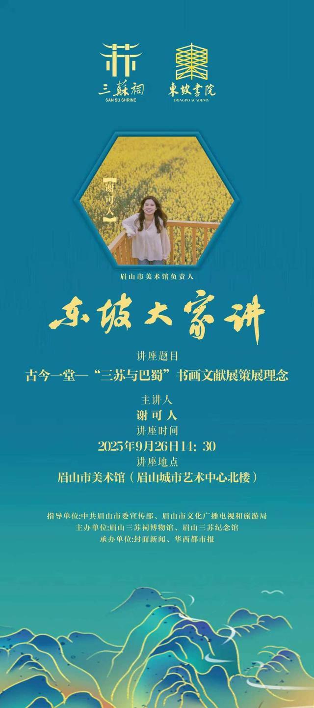 9月26日下午,《东坡大家讲·第二季》将走进眉山市美术馆,在“三苏与巴蜀书画文献展”现场,三位策展人谢可人、张家伟和翟晓楠,将为我们深入解读“三苏与巴蜀”。活动现场不仅有好听,更有好看。“我们将在三苏的诗文中,在当代名家的书画中,去看900多年前,出入巴蜀的三苏是怎么发朋友圈的。”