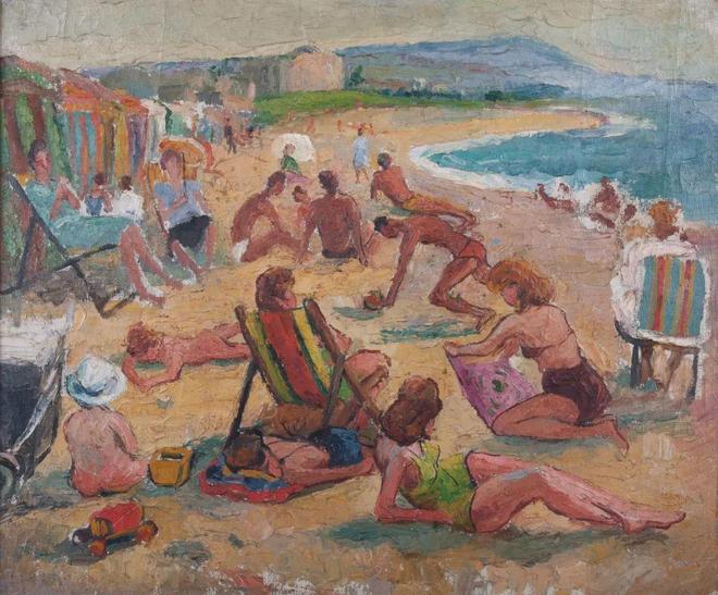 这幅《海滨浴场》里藏着独属于夏日的慵懒与热烈。画中的沙滩以暖色铺就,阳光的温度仿佛要溢出画布。冷色的海浪只占据画面一角,却仿佛轻拍着岸边,似有海风扑面而来。
