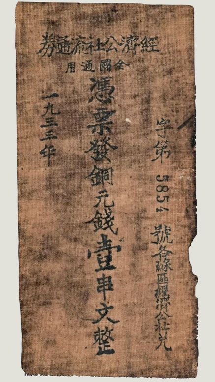 鄂豫皖苏维埃政府经济公社壹串文铜元流通券,1933年,布,打码机压印字号,长74、宽145毫米