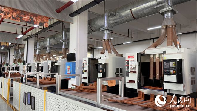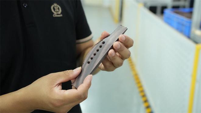 "以前每块面板都要用砂纸手工打磨3小时,遇到复杂镶嵌工艺,一天只能完成2把琴。"楚门乐器副总经理康卫平回忆,受制于传统工艺,以前企业年产仅1.2万把,订单交付常常要等上20多天。 面对日益增长的市场需求,传统生产方式成为楚门吉他发展的瓶颈。2023年,楚门吉他落户东安吉他产业园,开启智能化变革,两条全自动生产线应运而生。 “引入智能化设备后,从琴颈开槽到音梁雕刻都能通过机器一气呵成,我们的生产效率大幅提升。”康卫平轻抚着即将完工的吉他,音梁在灯光下泛着温润光泽。