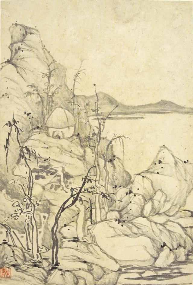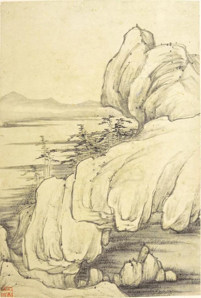 图五:写江畔巨岩,岩石简勾轮廓,略作皴染,岩边岩下以松树、水草及浅滩衬托,以实当虚。远山极淡,画面空灵、净洁,颇似金陵江景色。