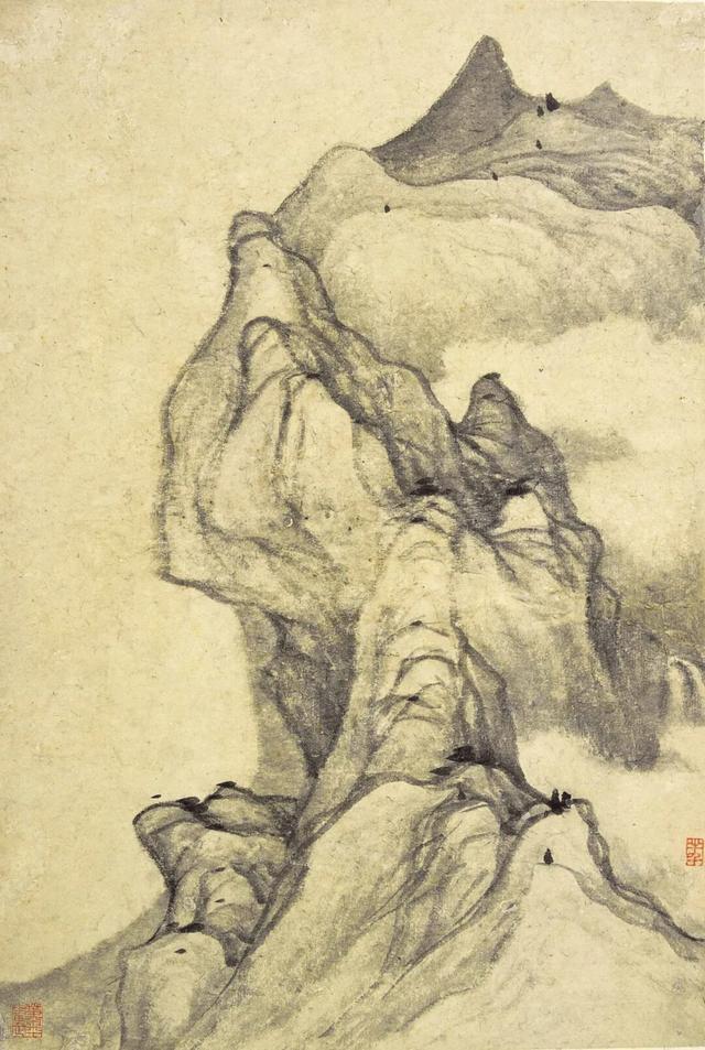 图三:写山峰两三重,白云幽壑,泉瀑隐其间。空山无树,唯山顶与峰峦交接处,作横、竖焦墨数点,真点睛之笔。用笔圆劲,棉里裹针;复以浓、淡墨皴擦,烘染出山石的浑厚与云雾、泉瀑之润泽,已具“灰龚”之雏形。