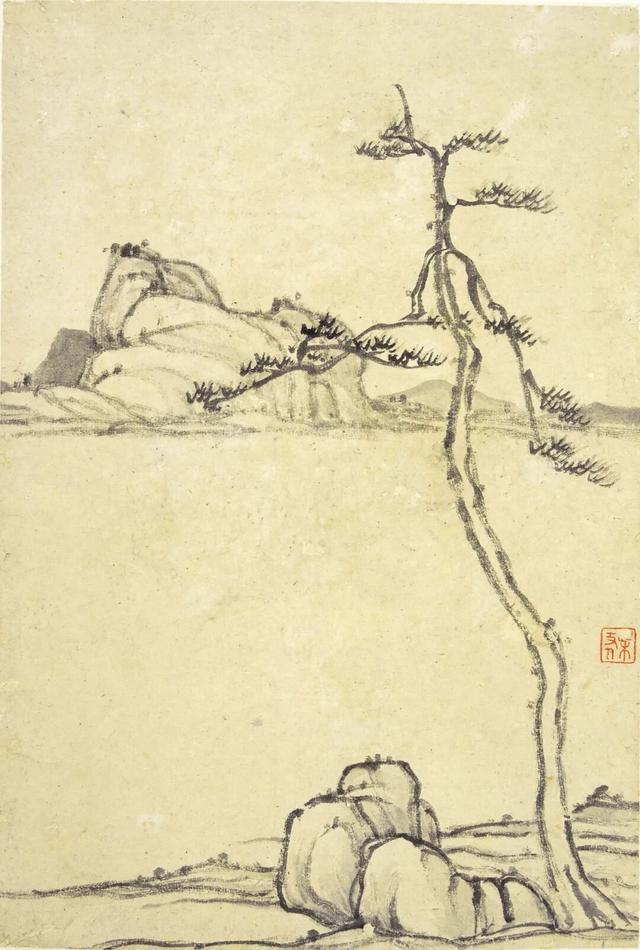 图一:写一水两岸,孤松一株,纵贯两岸,皆空勾无皴,取意云林子而变之,为全册笔墨最简约者。