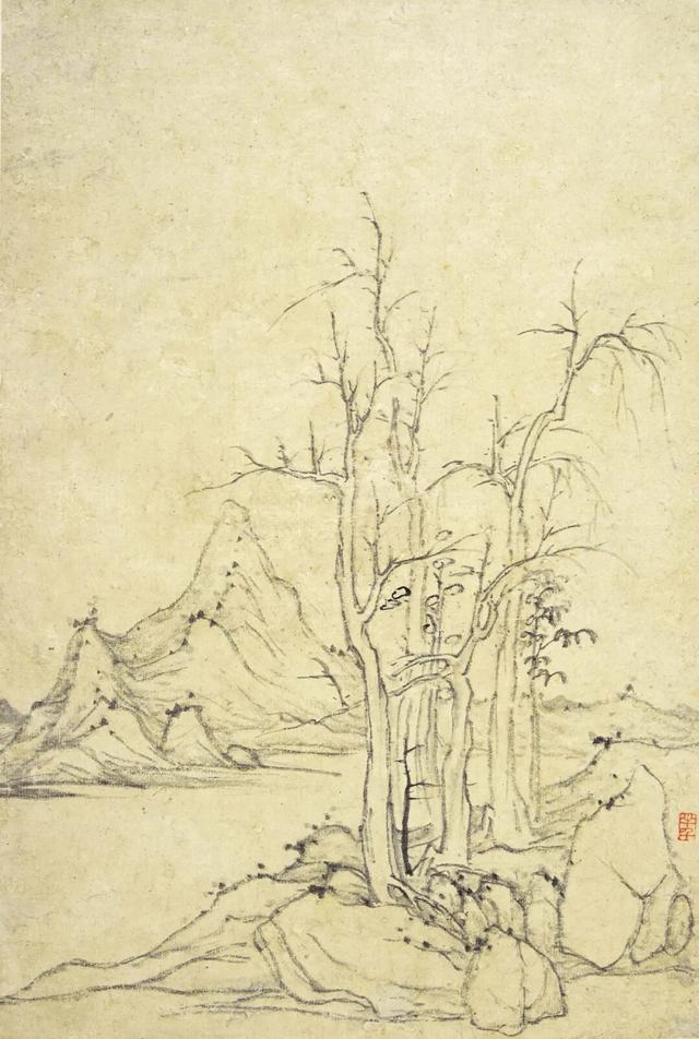图二:山水一隅,杂树七株,疏密有致,或高或低,或枯枝向上,或垂条而下。或夹叶,或介点,皆简略不繁,点到即止。
