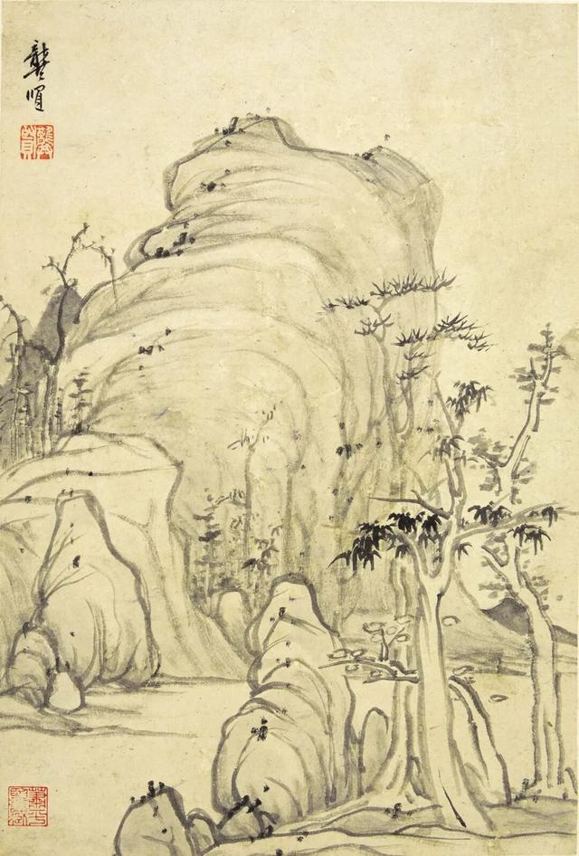 他的这一风格,也受到最早的老师董其昌和稍长于他的恽向的影响。都是力主“画家以简洁为上”者。南京博物院所藏董其昌《溪山秋霁图卷》,即以拙厚之线勾画山石,辅以部分密皴,形成灰白对照的方法。这一方法,在龚贤此册中有相当一致的体现。