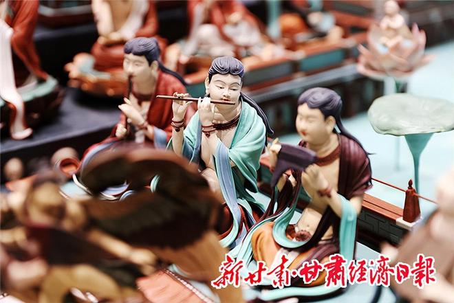 在1.4米长、2.4米宽的展台上,39尊面塑人物神态各异,伎乐舞者衣袂翻飞,飞天神女彩带飘曳,连衣纹褶皱间的光影都细腻如绢——这是平凉市级面塑非遗代表性传承人杨凯为敦煌文博会精心打造的作品《观无量寿经变》。以面团为笔、以匠心为墨,他将榆林窟千年壁画转化为立体艺术,让崆峒面塑这一小众技艺在国际舞台上焕发新光。
