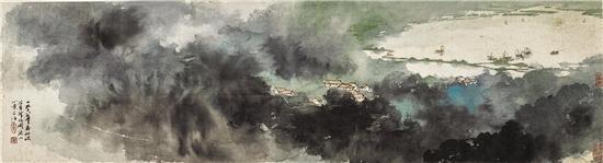 宋文治“小泼彩”创作方法既简单直接又充满创意:一种是借鉴水印木刻拓印的方法,在玻璃板上倾倒颜色,加入清水,任其自由流淌混合,形成自然天成的色墨交融与肌理,再覆以卡纸拓取痕迹;一种是将颜色直接泼洒在宣纸上,依靠宣纸的特性让色彩自然洇化晕染;还有一种则是用揉皱的纸团蘸取颜色,在纸面上根据构思进行轻重缓急的拖按。这些方法都极大地利用了色彩的流动性和偶然性。随后,宋文治会根据这些偶然形成的色彩形态和肌理,以严谨的匠心进行构思加工,巧妙地添加树木、房屋、小舟、远山等具象元素。这种创作过程使得画面既充满了偶发性带来的生动意趣和自然天成的韵味,又经过画家的精心收拾,最终达到氤氲弥漫、色彩斑斓而又不失法度的艺术效果。