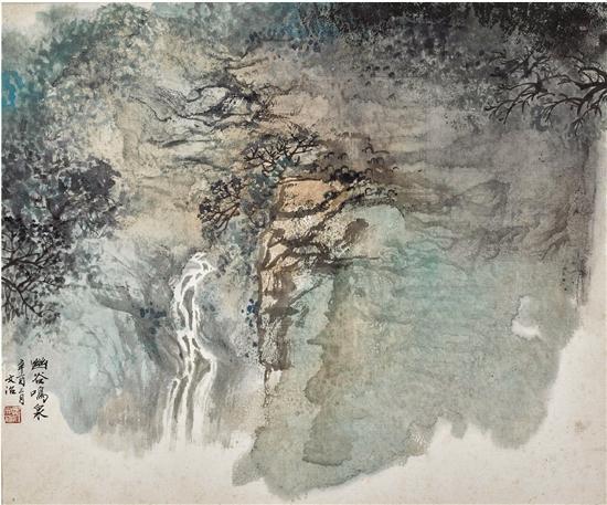 创作于1981年的《幽谷鸣泉》,正是宋文治“小泼彩”艺术成熟期的精彩之作,充分体现了其晚年求新求变的艺术精神。在创作此画时,宋文治运用了其探索的技法之一:借鉴水印木刻拓印之法。他先在玻璃板上倾倒颜色,加入清水,任其自由洇漫流淌,形成自然天成的色墨交融与肌理,再覆以卡纸拓取这流动的瞬间。拓印之后,画家并非被动描摹,而是根据色彩流动后产生的抽象形态,“因势赋形”地进行艺术构思与加工,以皴擦笔法勾勒点染出山石的肌理结构,并精心添加灌木丛林等细节。整幅作品以青绿为基调底色,间或微施淡墨、赭石进行调和与点缀,色彩过渡自然灵动,毫无刻意雕琢的痕迹。画家在拓印形成的偶然基础上,将主动的皴擦笔法与流动的色彩完美融合,相得益彰,使画面充满了浑然天成的意趣。作品仅取山水小景一角,青霭幽幽,鸣泉淙淙,整体营造出一种清新脱俗、空灵秀逸的艺术境界,堪称宋文治“小泼彩”山水的典范之作。