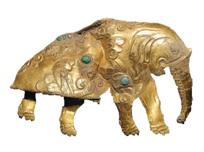 血渭一号墓出土的镶绿松石金象饰片(中国社科院考古所供图)