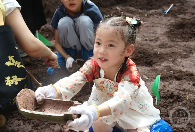 10月1日,重庆市沙坪坝区,小朋友在动手体验模拟挖掘文物。