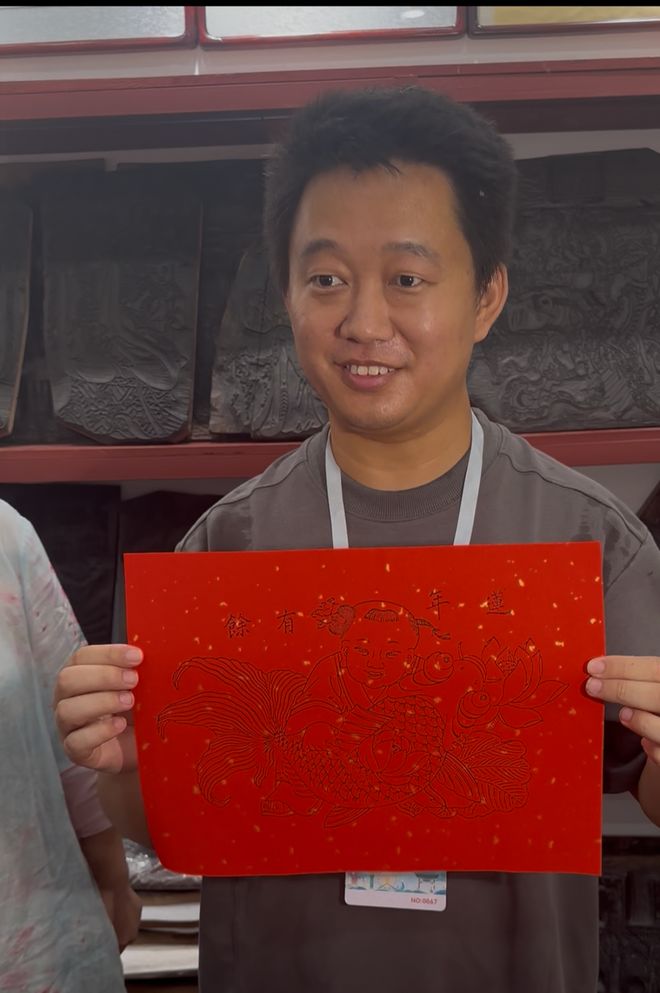 7日,红星新闻记者就在张宏指导下,仅用半分钟就完成了经典年画“莲年有余”的印制,获得了一张年画半成品。