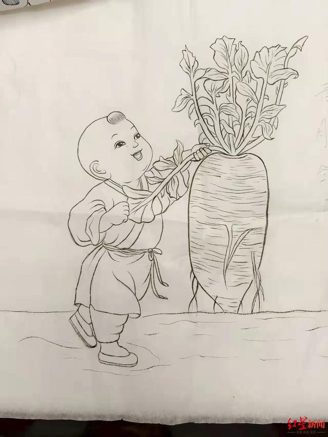 另外,张宏还把年画与当地农产品沙窝萝卜相结合,绘制了一幅胖娃娃和沙窝萝卜的年画作品。目前,这幅作品画稿已经完成,正在等待绘制和雕版。完成后,当地种植萝卜的农户可以用这个形象做宣传、做包装,帮助萝卜的销售。