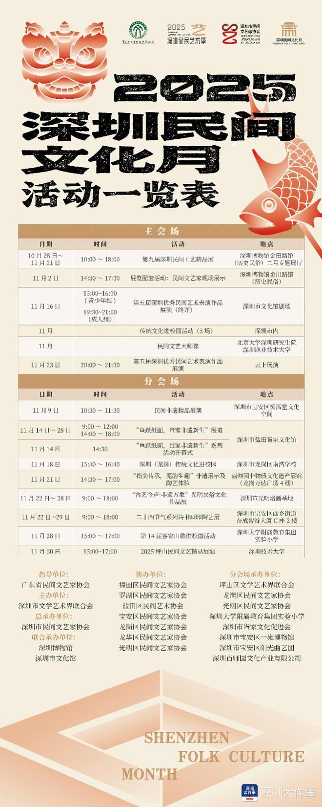 2025深圳民间文化月通过展览、展演等系列精彩纷呈的民间文艺主题活动让民间艺术从“被看见”到“被激活”,让公众近距离感受沉淀于岁月深处的技艺之美、文化之厚;大师课等特别聚焦青少年群体,将民间文艺的深厚底蕴转化为生动鲜活的“青春课堂”,促使青少年儿童成为文化自信的自觉传承者与活力创新的生力军;用心探索以民间文化繁荣赋能中国式现代化深圳实践的崭新路径,使传统文化在现代都市焕发新时代的蓬勃生机,为深圳建设更具全球影响力的现代化国际大都市注入深沉而鲜活的文化动能。