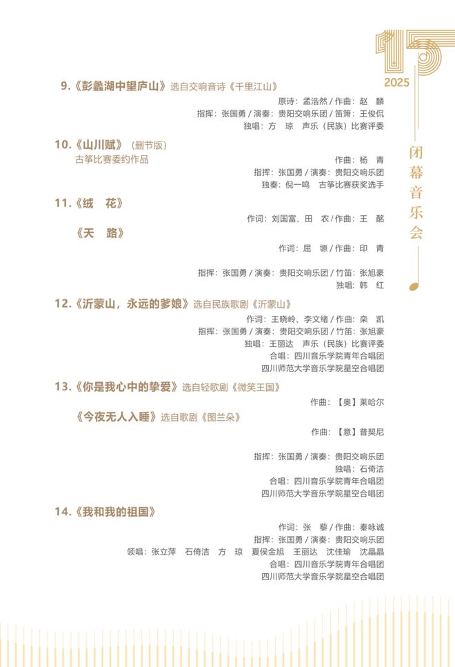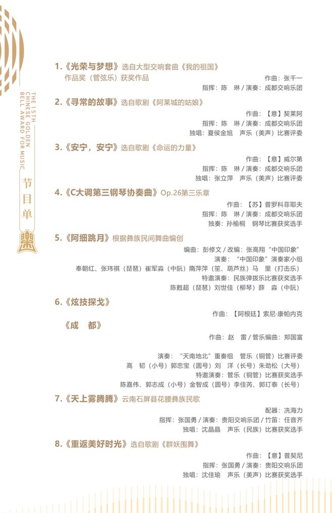 今日(10月29日)晚,第十五届中国音乐金钟奖颁奖暨闭幕音乐会将在成都城市音乐厅举行。闭幕音乐会星光熠熠,本届金钟奖评委夏侯金旭、方琼、张立萍、王丽达将携手钢琴、声乐、民族弹拨乐、管乐(铜管)、古筝比赛获奖选手,以及石倚洁、韩红等艺术家,将联袂为观众呈现一场多元融合的音乐会。乐迷朋友可通过央视频、成都发布、红星新闻等平台同步观看。